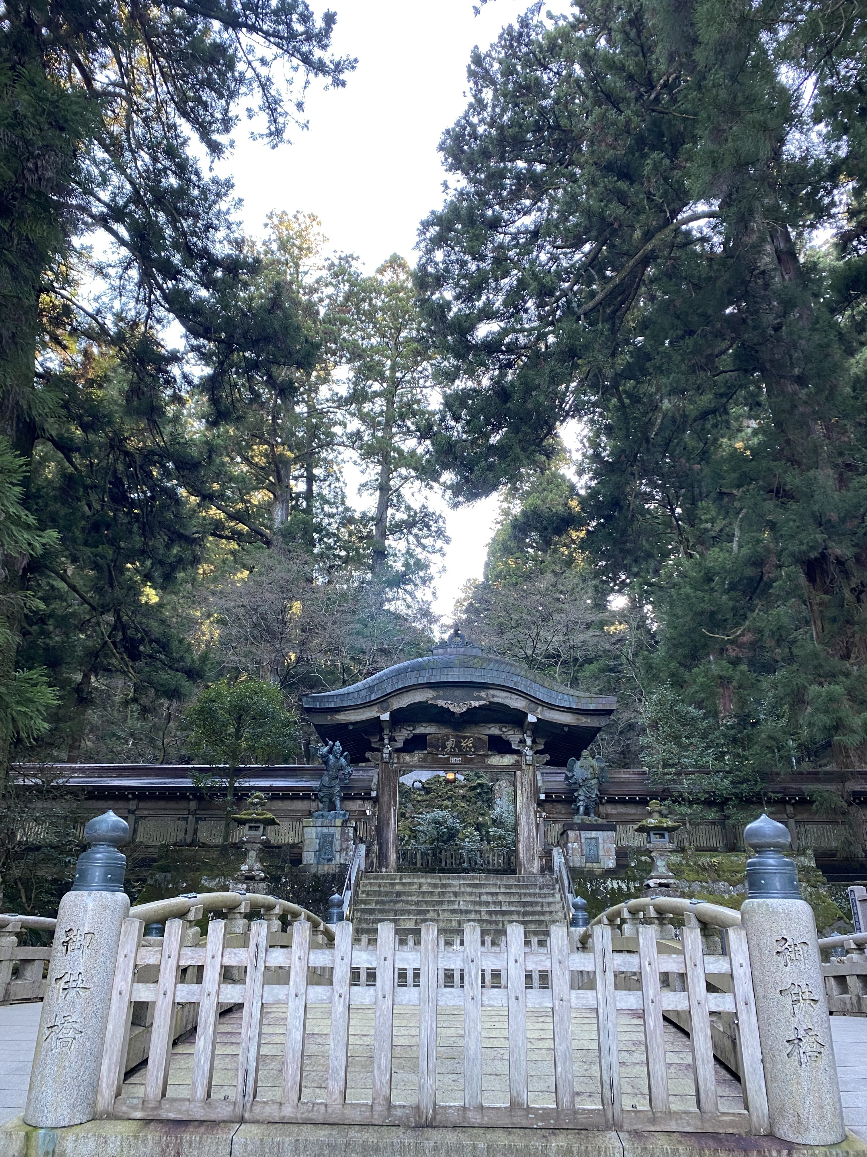 奥の院周辺は杉の木に囲まれているので、黄色の落ち葉の絨毯ができており、階段にも落ち葉が積もっていました。